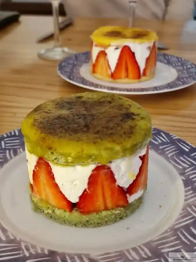 Fraisier japonais au matcha sans gluten et sans beurre : biscuit cotonnier vert, chantilly vanillée et yema caramélisée au chalumeau. 3 fraisiers individuels.