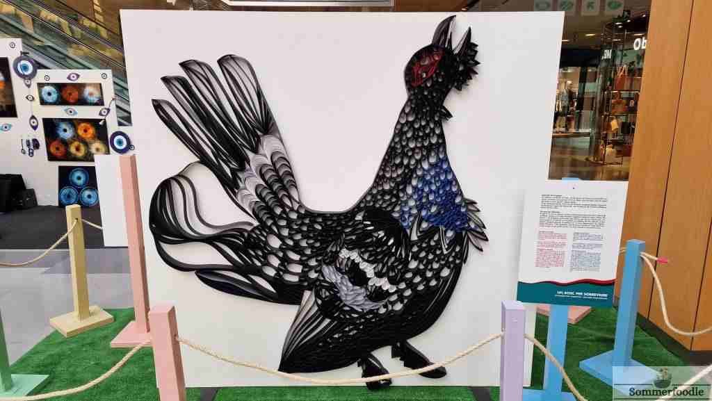 Il y a plusieurs techniques exposées, notamment celle avec du papier quilling. Il s’agit de bandelettes en papier que l’on roule et que l’on colle en fonction du motif souhaité. Si vous voulez en connaître un peu plus sur cette technique , voici un blog très complet : Happy Quilling
