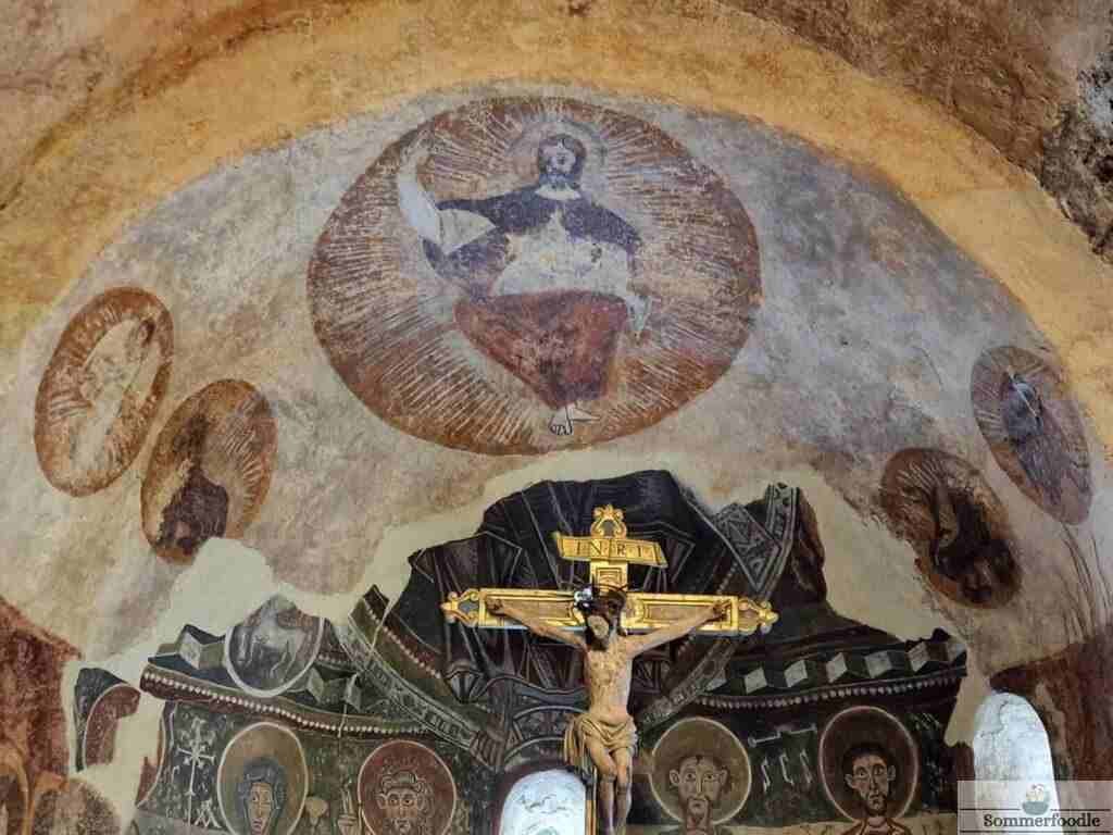 L’église domine le site, tant géographiquement que symboliquement. Elle est adossée au promontoire rocheux sur lequel sont les ruines défensives. Le sol de la chapelle est d’ailleurs à même la roche.